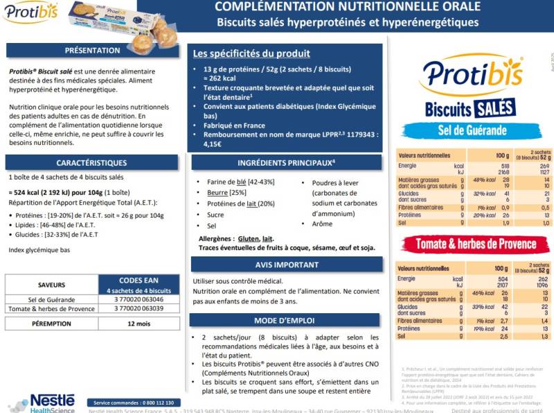 PROTIBIS est un complément nutritionnel oral indiqué pour les besoins nutritionnels des patients adultes en cas de dénutrition. Ce sont des galettes pur beurre et Biscuits salés hyperprotéinés et hyperénergétiques.